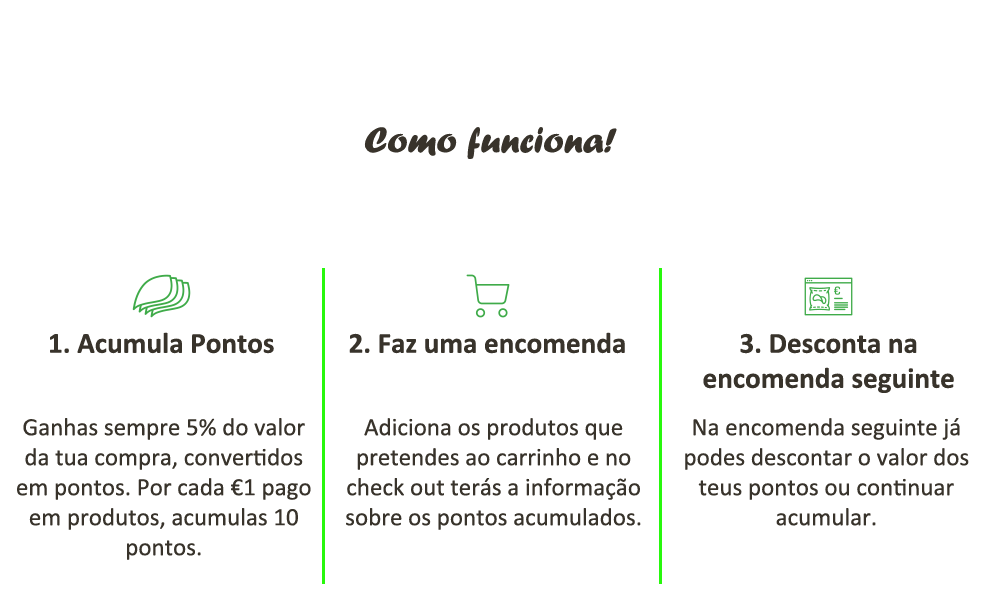 2º Acumula sempre 5% do valor da tua compra (covertidos em pontos) em todas as compras que realizares na nossa Loja Online;