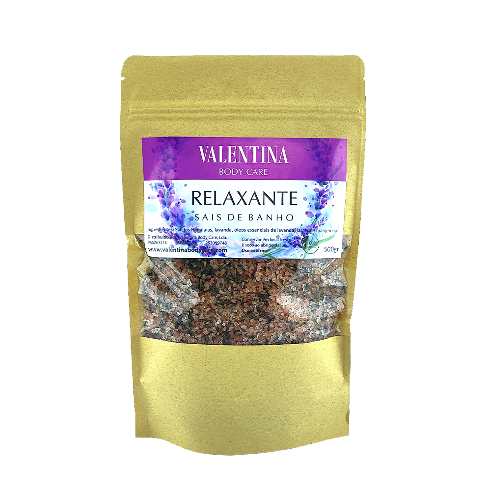 Mix de sal dos Himalaias com óleos essenciais de Lavanda, Laranja e Manjerona, com óleo vegetal de Grainhas de Uva e flores de Lavanda para um banho relaxante.