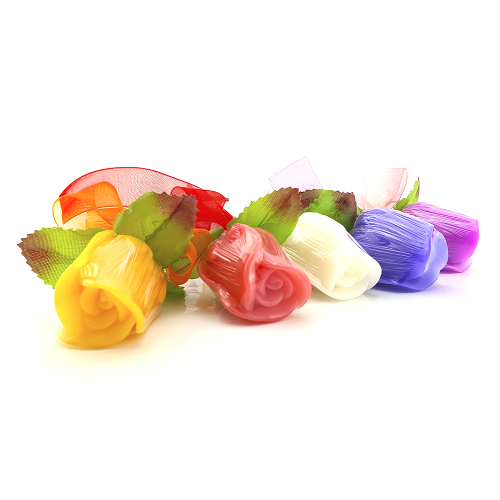 Lindos botões de rosa em sabonete, com pauzinho forrado e folha, para formar bouquets ou presentear amizades. Este modelo pode integrar arranjos com outros modelos (flores, etc.) ou parte de conjuntos a personalizar.