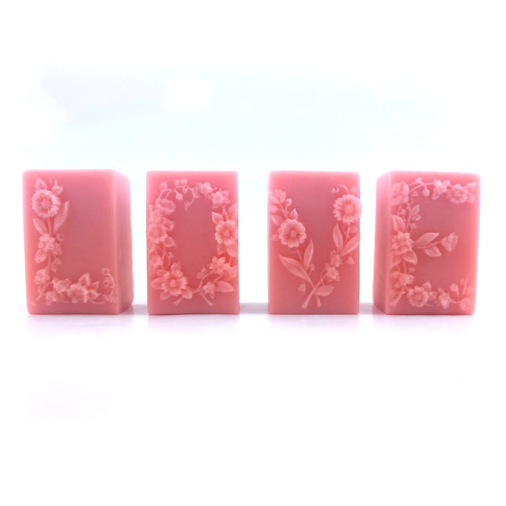 Conjunto de 4 sabonetes a formar a palavra LOVE, com rosas em relevo a desenhar as letras. Este modelo pode integrar arranjos com outros modelos (flores, etc.) ou fazer parte de conjuntos a personalizar.