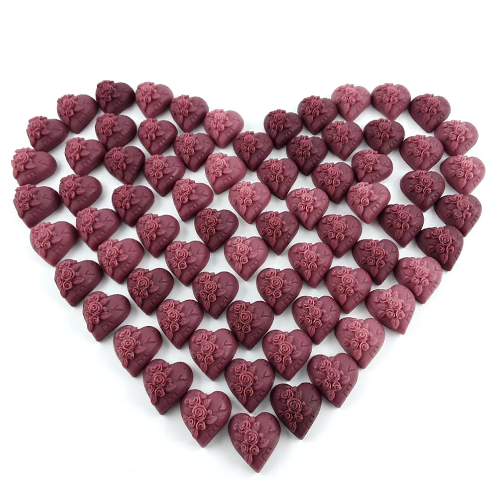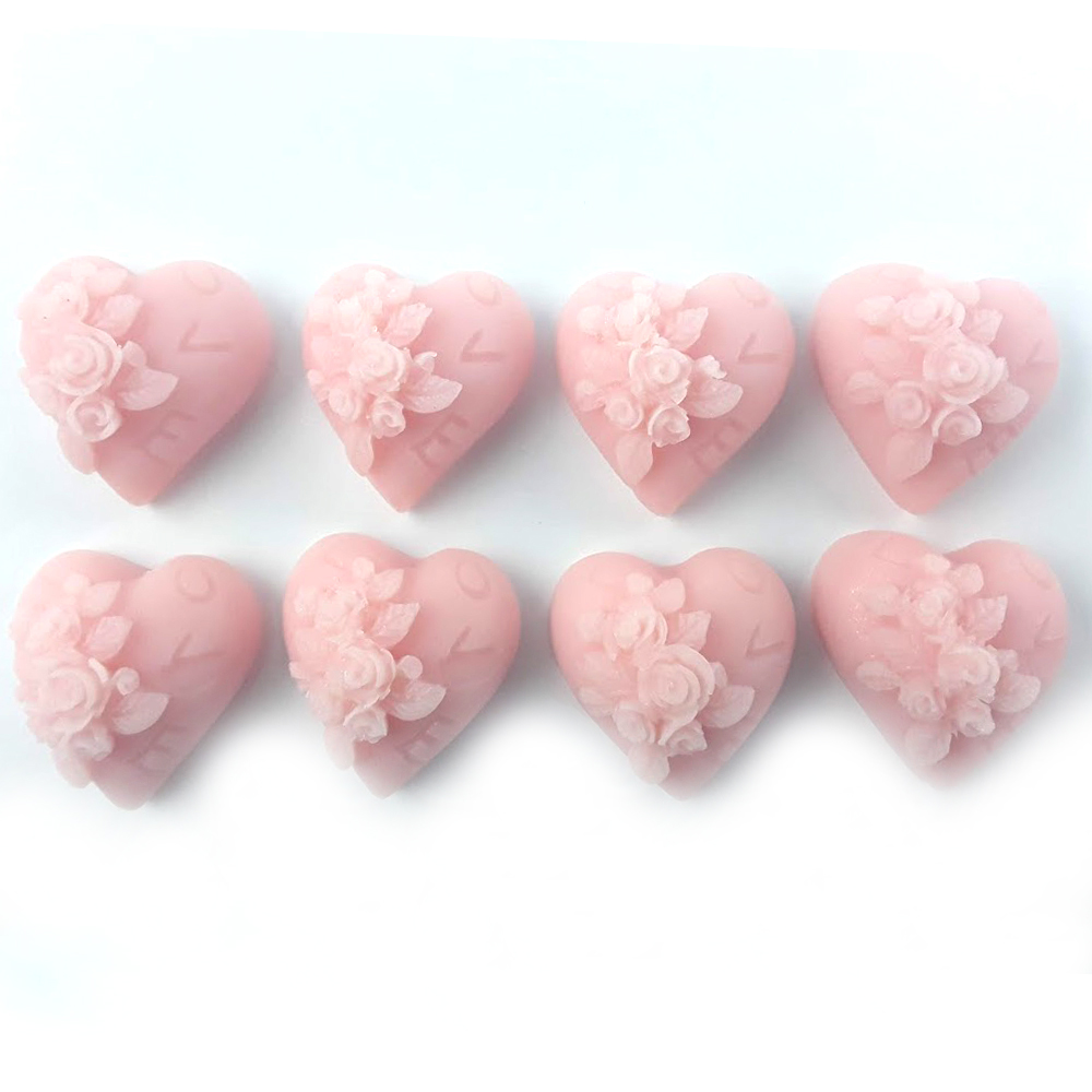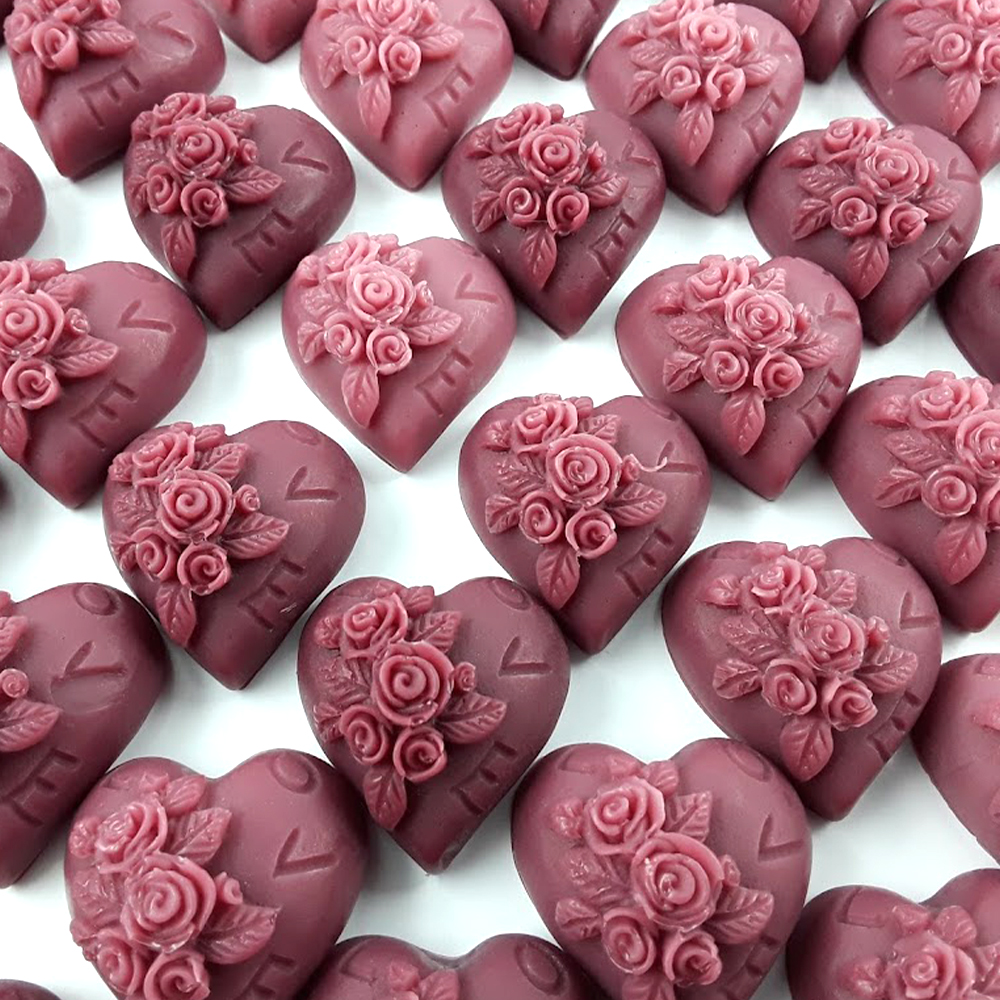 Pequeno coração em sabonete com rosas em relevo e incrição LOVE. Este modelo pode integrar arranjos com outros modelos (flores, etc.) ou fazer parte de conjuntos a personalizar.