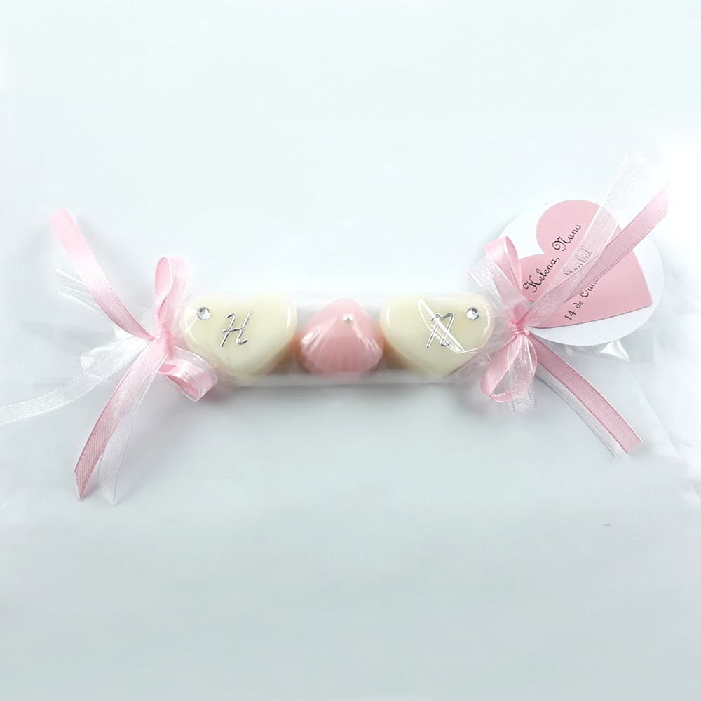 Embalado em saquinho de celofane transparente, com fitinhas de organza e cetim. As aplicações (corações brilhantes, outros brilhantes, letras, etc.) têm um custo acrescido, pelo que deverá entrar em contacto connosco.