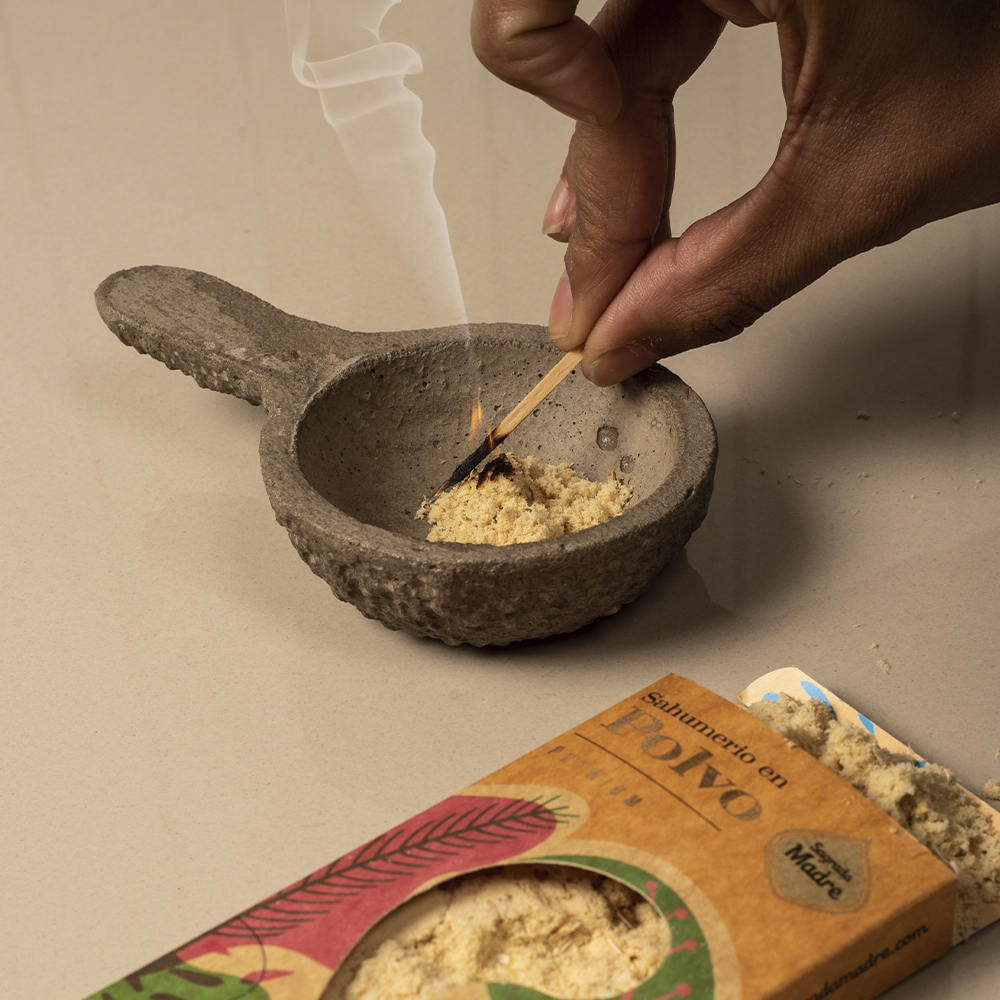 1. Use a colher que vem na embalagem para colocar uma pequena porção do incenso em pó num queimador não inflamável e que proteja do calor: pode ser cerâmica, barro ou metal (pode ver os nossos aqui) Coloque em cima de um carvão vegetal ou forme um montinho com os dedos e acenda com um fósforo ou isqueiro. Não sopre!