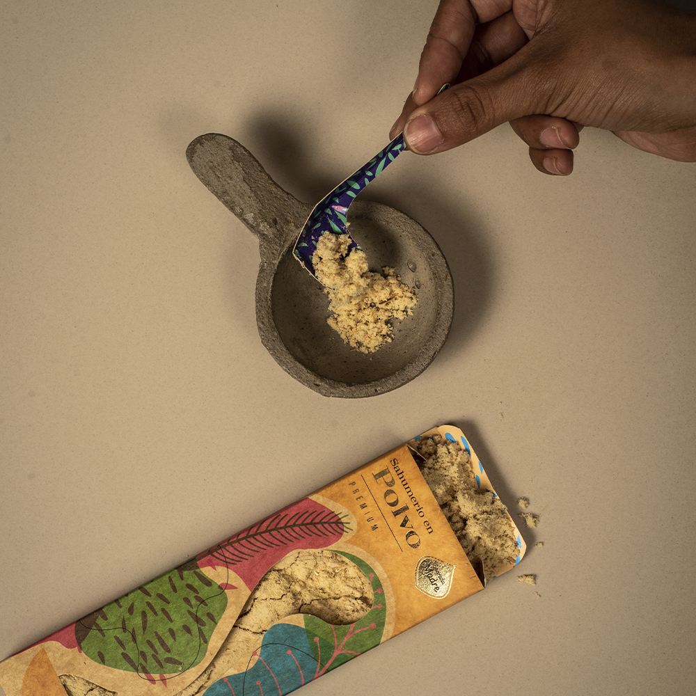 Para facilitar o uso deste tipo de incenso, cada embalagem inclui uma colher em papelão, que permite melhor dosear o incenso em pó.