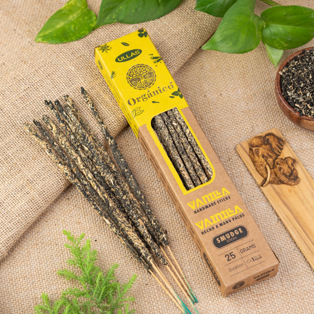 Os incensos orgânicos Ullas são produzidos artesanalmente com matérias‑primas naturais e técnicas tradicionais indianas. Cada vareta é moldada à mão, garantindo textura uniforme e combustão suave. As fragrâncias são extraídas de óleos essenciais, resinas e ervas puras, sem aditivos sintéticos. Este processo respeita o meio ambiente e valoriza o saber ancestral, resultando em aromas autênticos, duradouros e ideais para meditação, relaxamento e purificação energética.