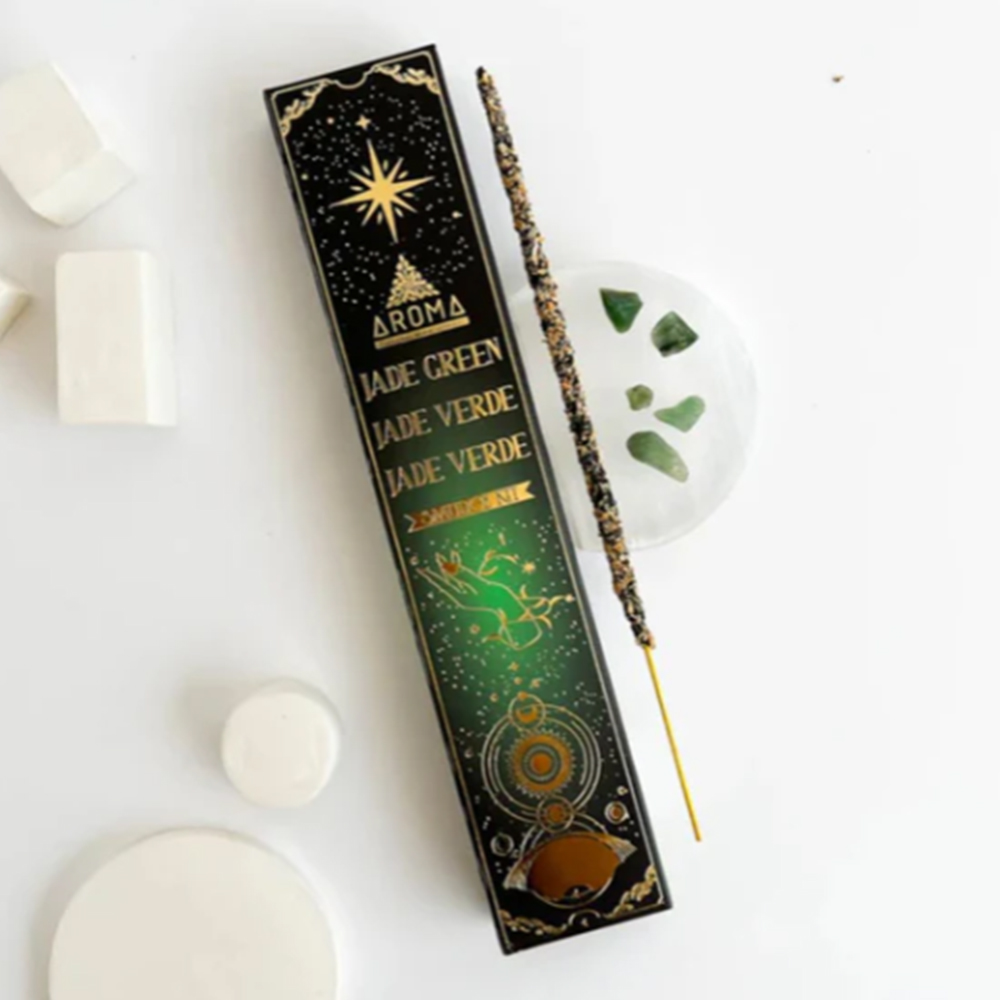 Cada caixa contém cristais de Jade verde + incensos.