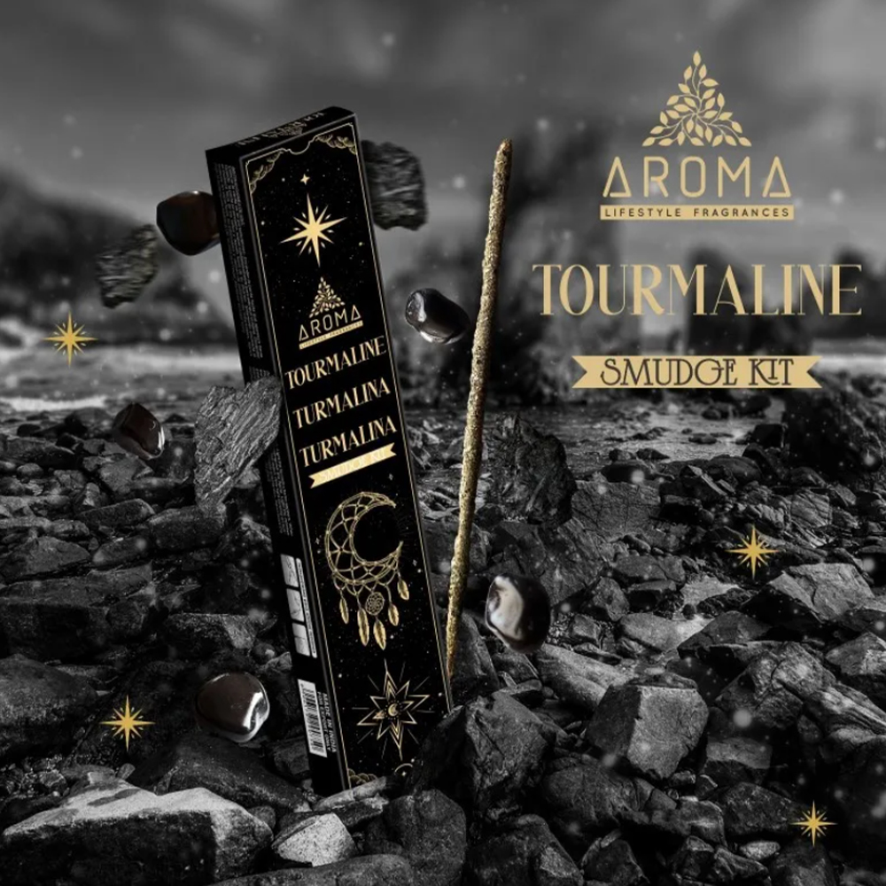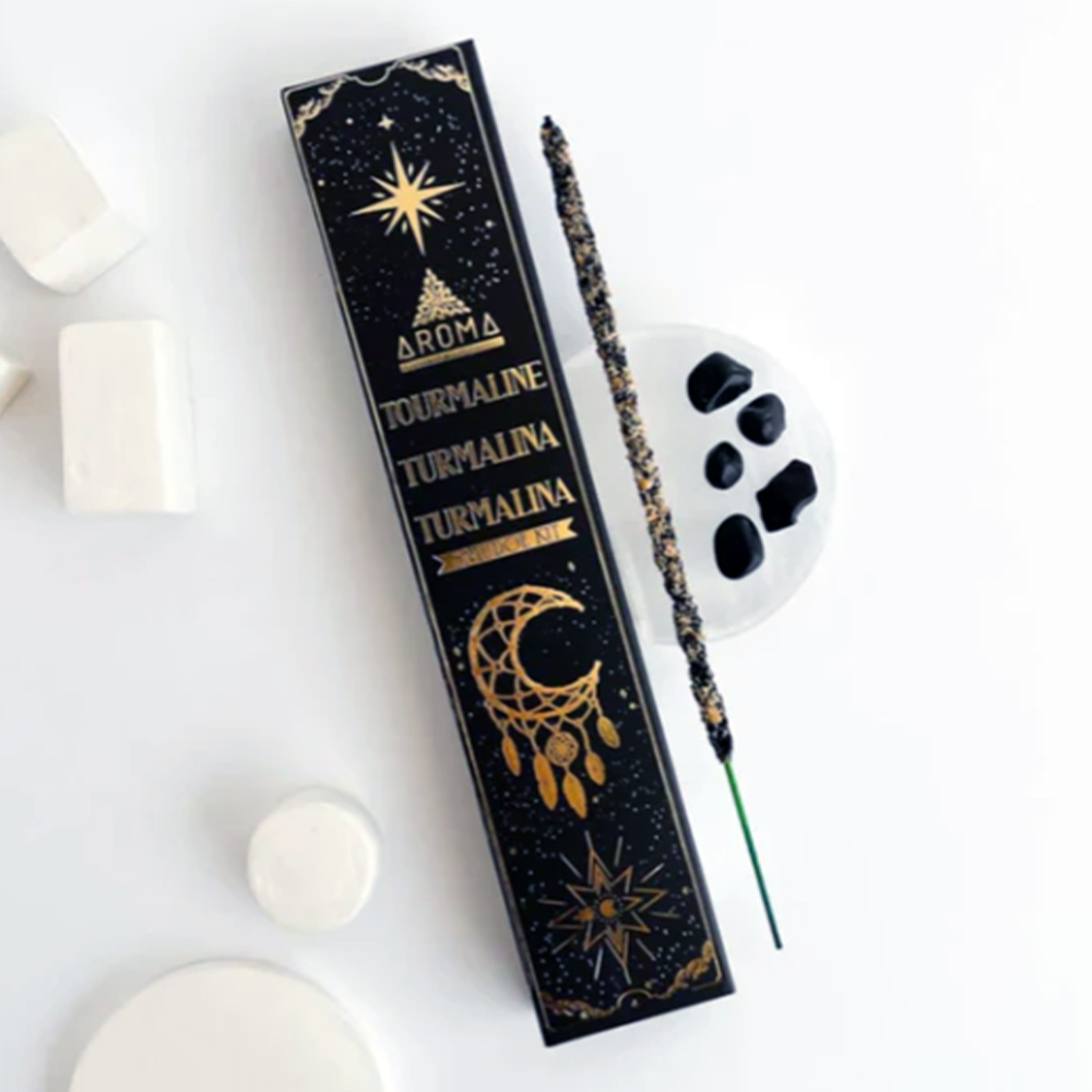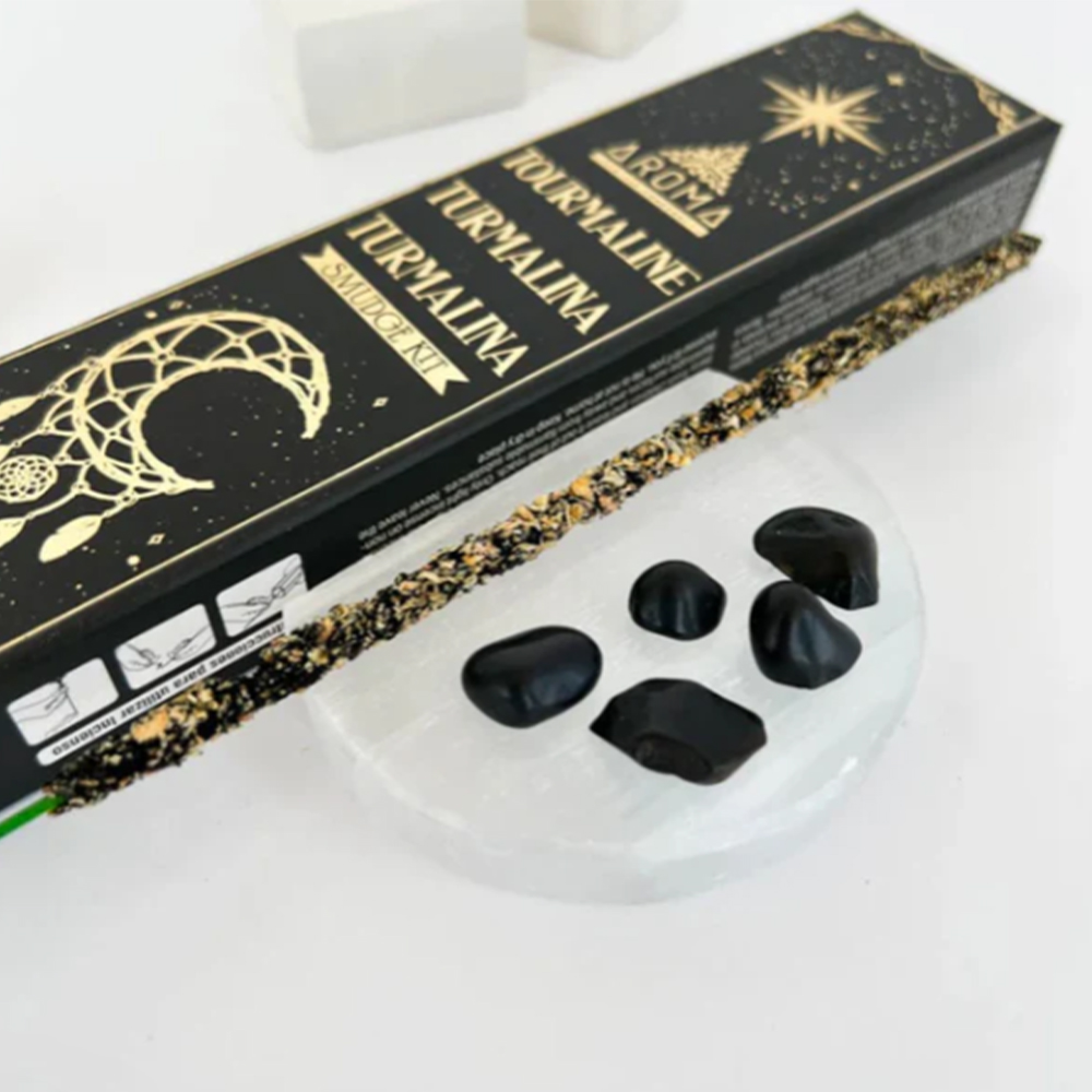 Cada caixa contém cristais de Turmalina Negra + incensos.