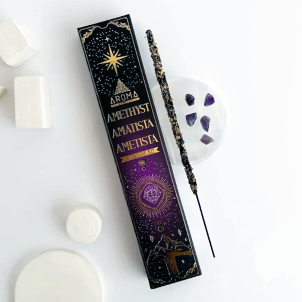 Cada caixa contém cristais de Ametista + incensos.