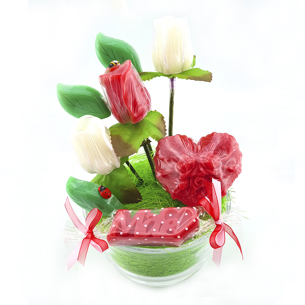 Este modelo da palavra Mãe em sabonete, com um coração é um miminho insispensável nas suas ofertas do Dia da Mãe. Perfumado, este modelo pode integrar arranjos com outros modelos (flores, etc.) ou parte de conjuntos a personalizar.