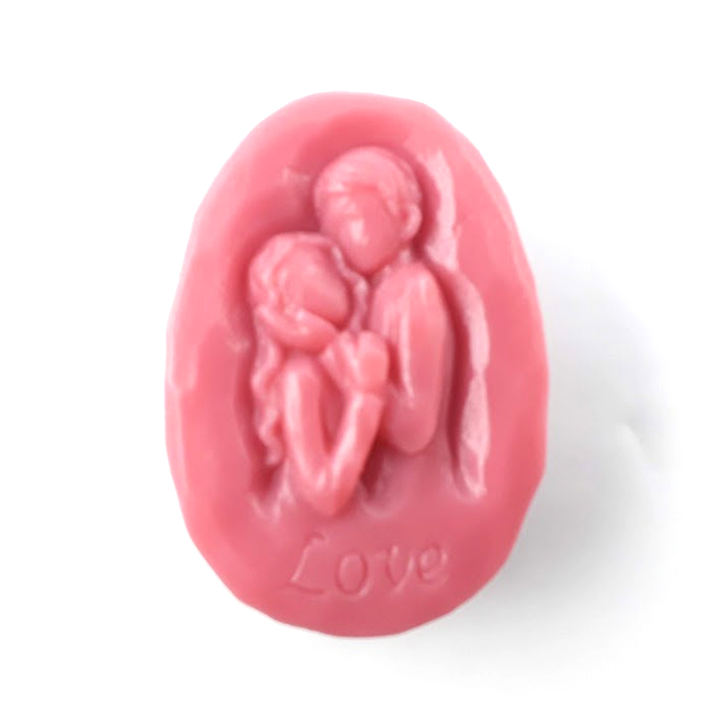 Casal em sabonete que remete a uma escultura, com inscrição LOVE. Este modelo pode ser uma linda lembrança de casamento, integrar arranjos com outros modelos (flores, etc.) ou fazer parte de conjuntos a personalizar.
