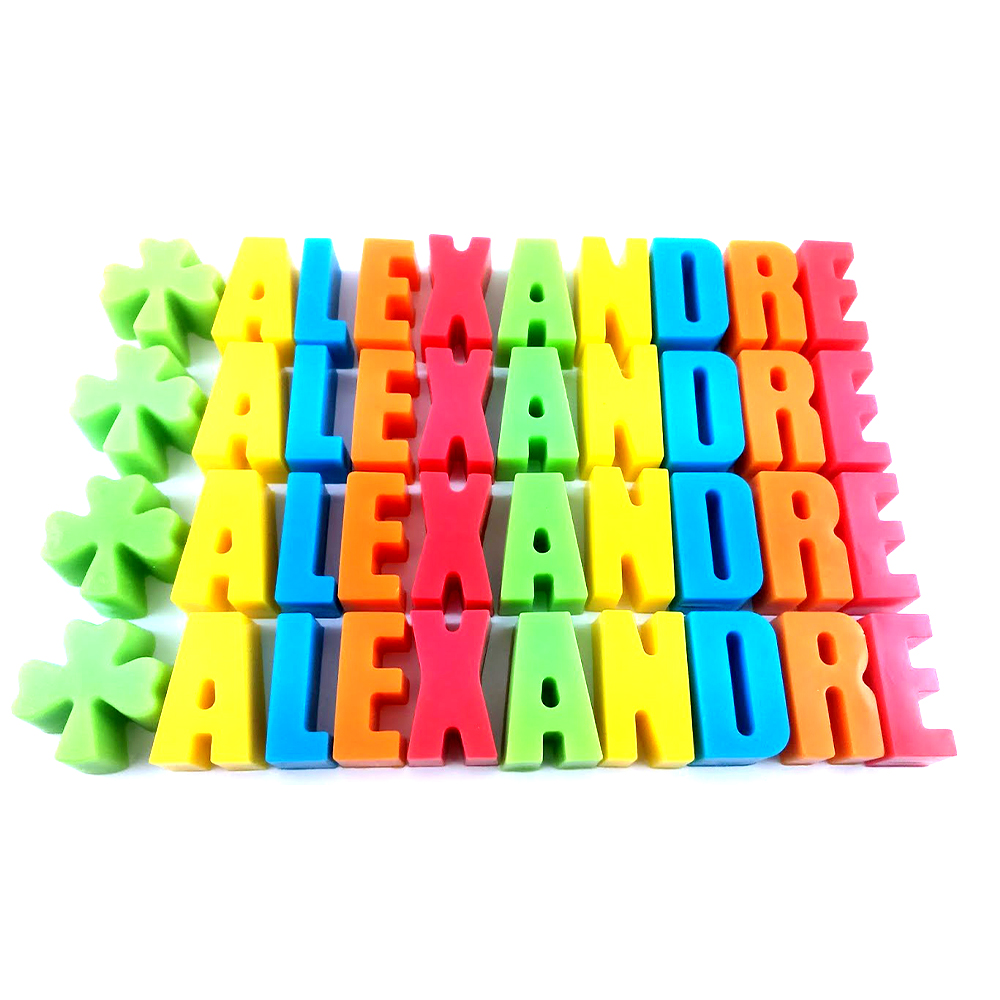 Para personalizar uma oferta, que tal oferecer o nome do presenteado em sabonete perfumado? Irá garantidamente deixar qualquer aniversariante surpreendido e feliz! Pode também presentear os convidados com a inicial do nome, ao seu agrado! Este modelo pode integrar arranjos com outros modelos (modelos à escolha) ou parte de conjuntos a personalizar. Ideal em qualquer comemoração!