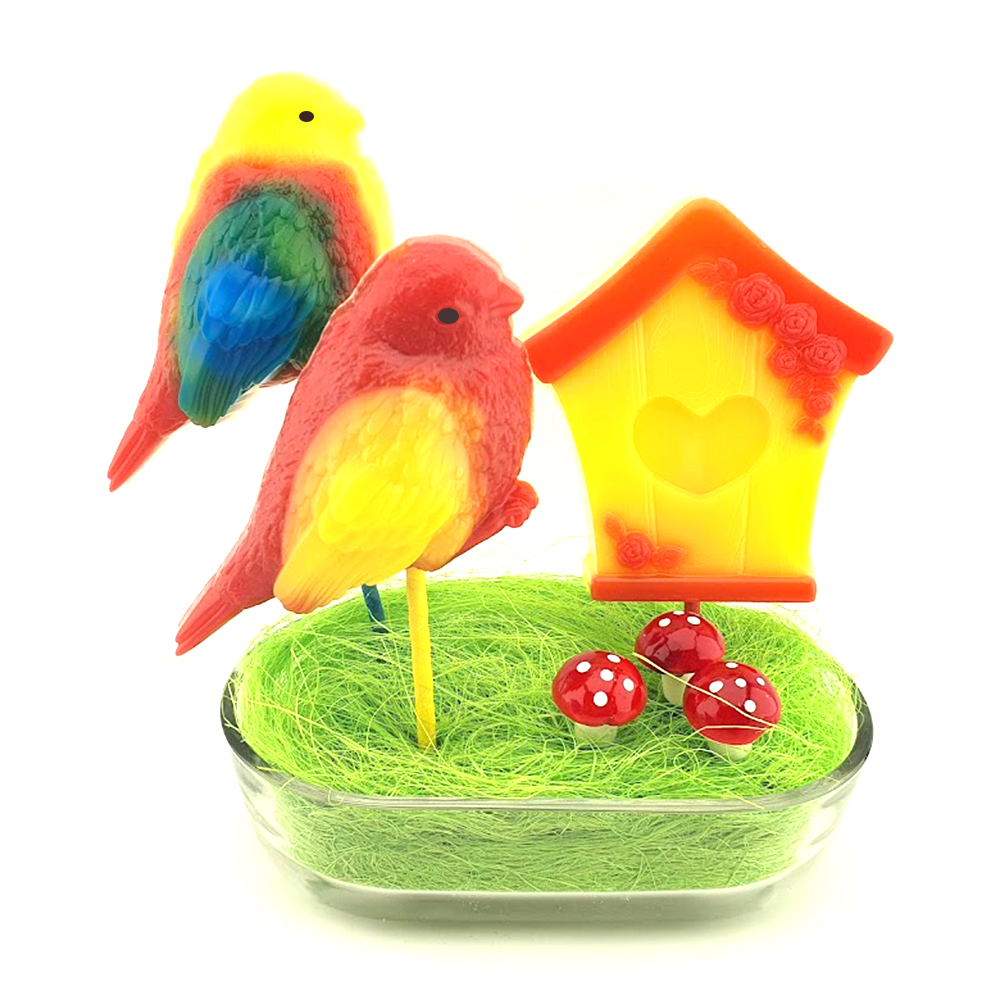 Lindo passarinho em sabonete, ideal para oferecer a fãs de animais, em qualquer ocasião. Este modelo pode ainda integrar arranjos com outros modelos (flores, etc.) ou parte de conjuntos a personalizar.