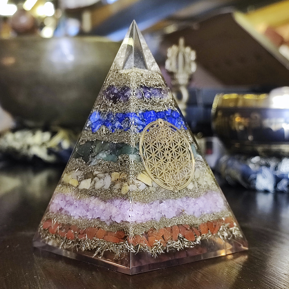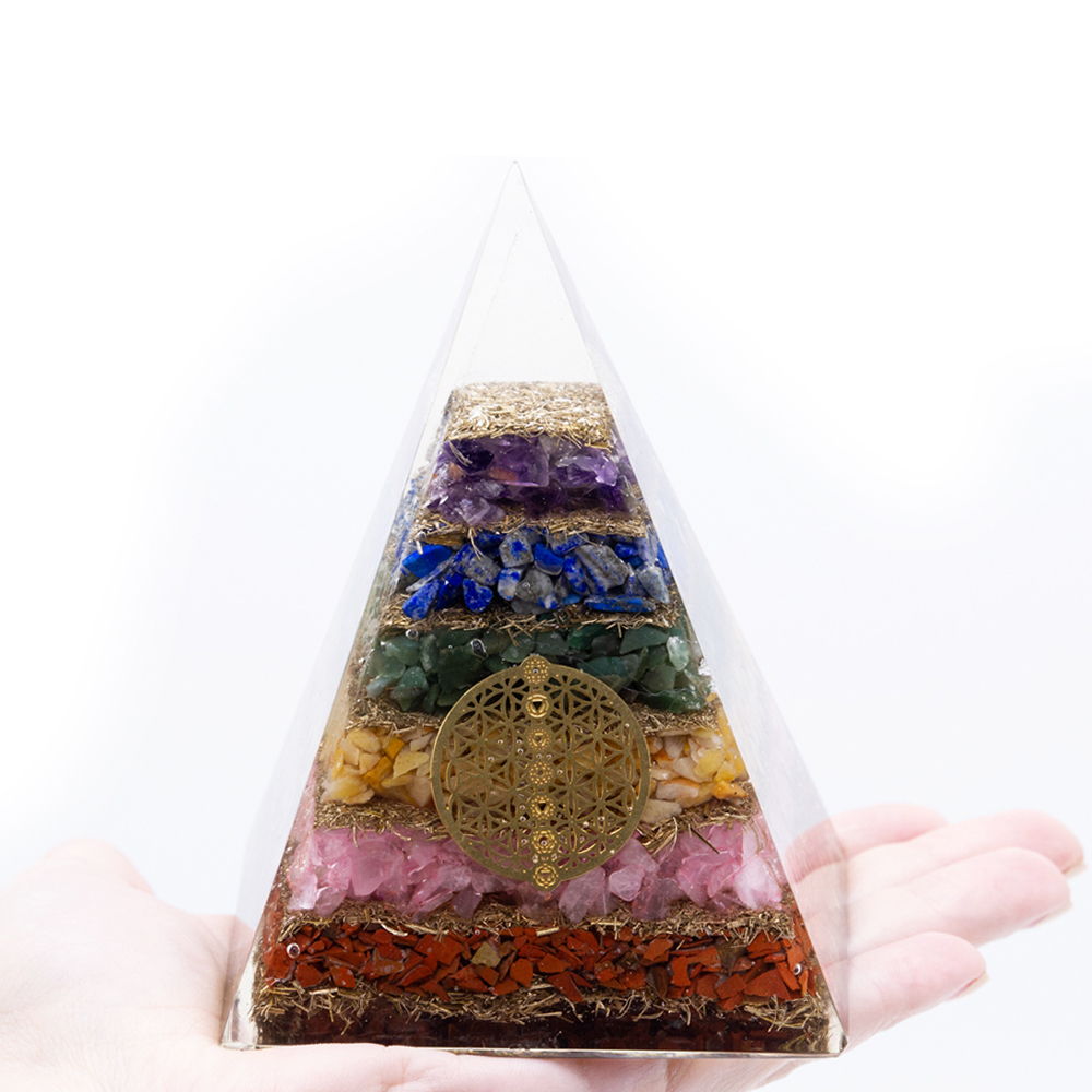 Pirâmide de Orgonite com Gemas dos 7 Chakras