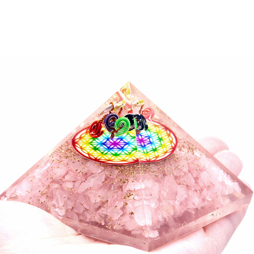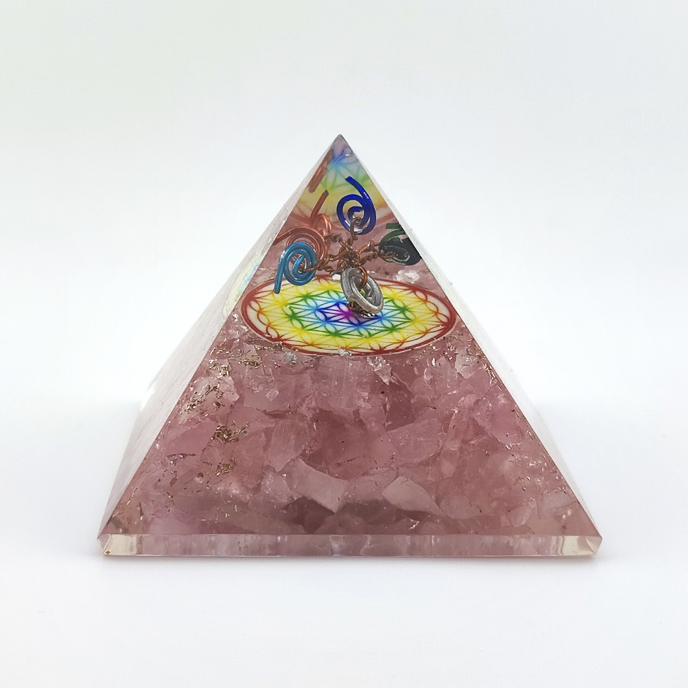 Pirâmide de Orgonite Flor da Vida e Quartzo Rosa com Arco-íris