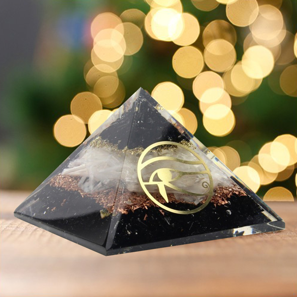 Pirâmide Orgonite Olho de Hórus com Turmalina Negra e Selenita