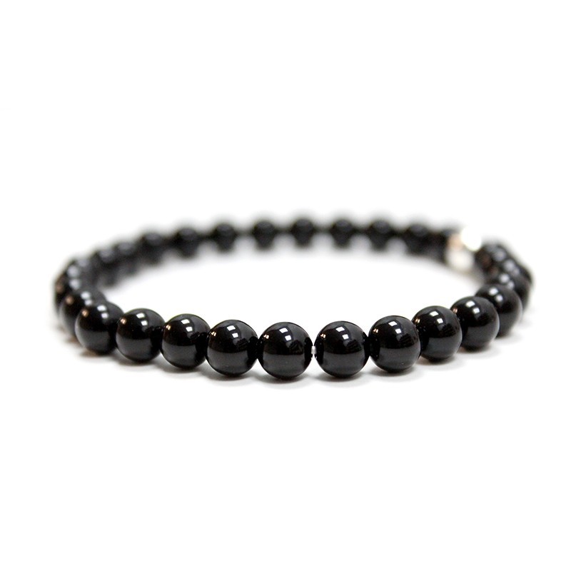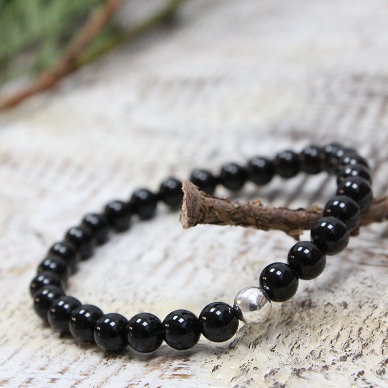 Pulseira de Ágata Negra com esferas lisas e pérola de Prata 925