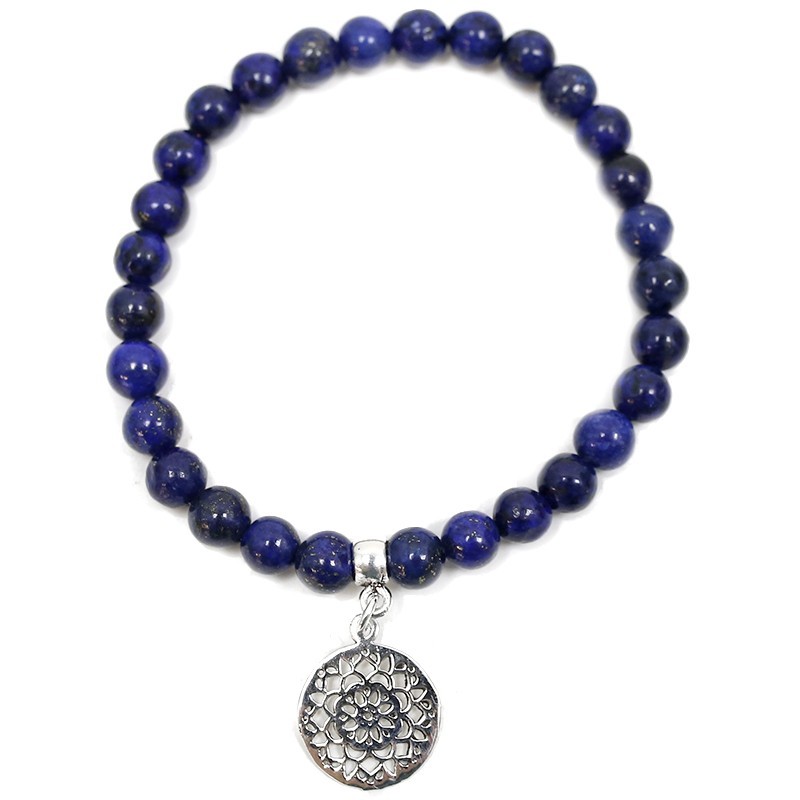 Pulseira de Lápis-Lazúli com esferas lisas de 6 mm e medalha de Mandala de Prata 925