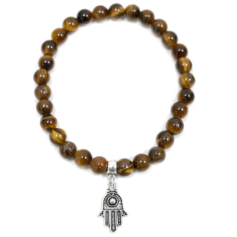 Pulseira de Olho de Tigre com esferas lisas de 6 mm e Mão de Fátima de Prata 925