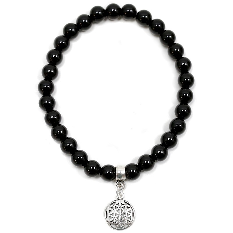Pulseira de Ónix com esferas lisas de 6 mm e medalha de Flor da Vida de Prata 925