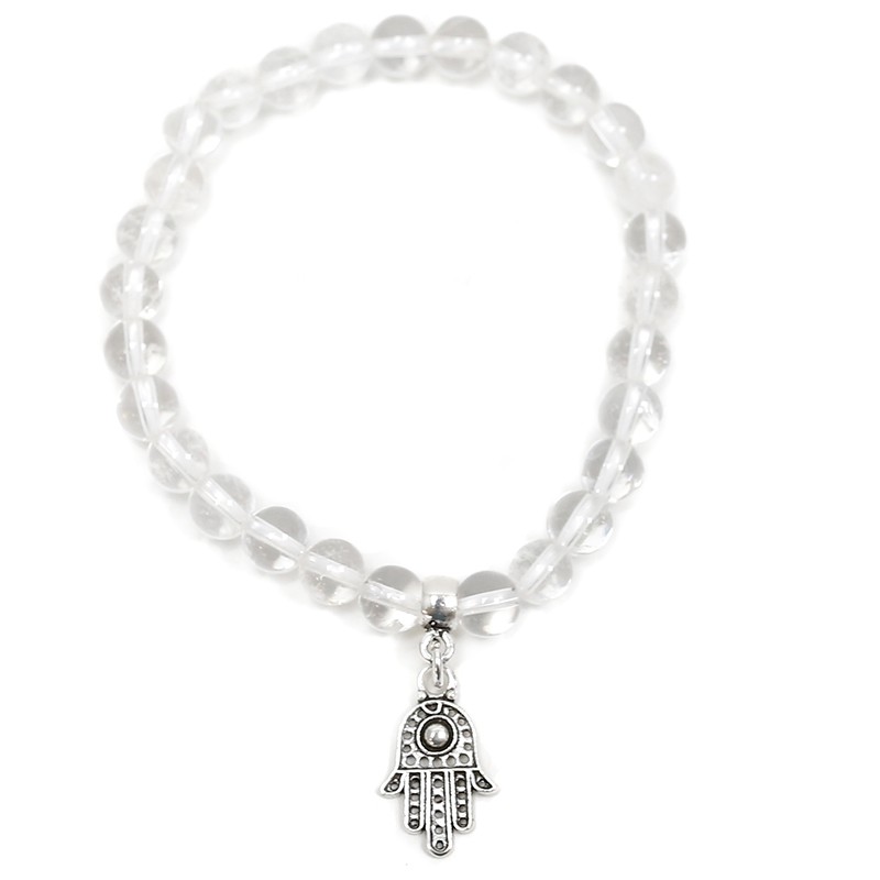 Pulseira de Quartzo Cristal Com Mão de Fátima de Prata