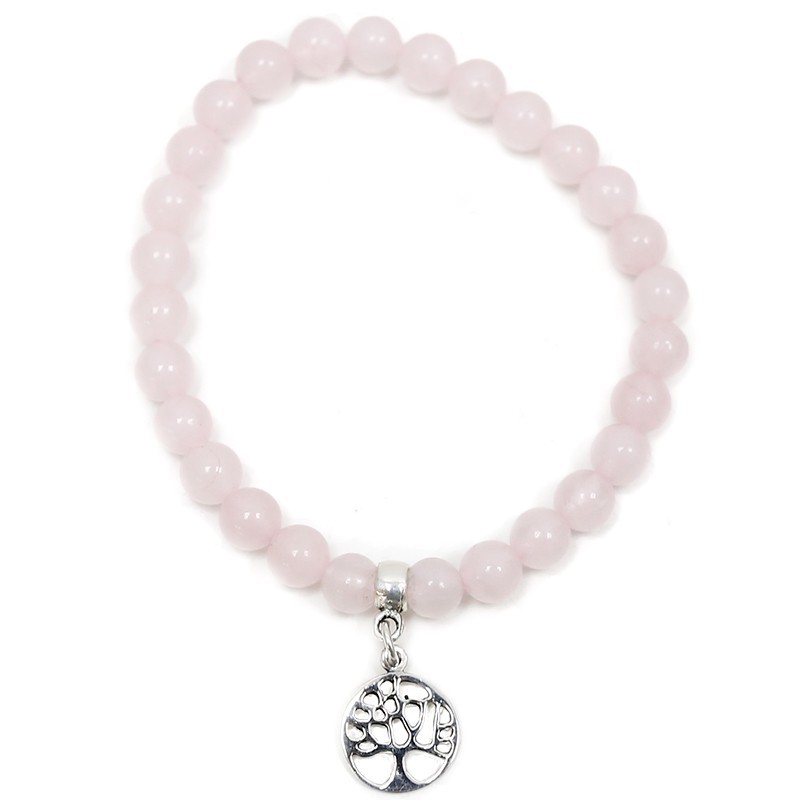 Pulseira de Quartzo Rosa Com Árvore da Vida de Prata