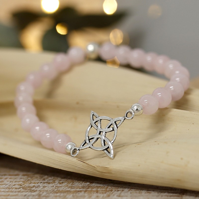 Pulseira de Quartzo Rosa Com Nó de Bruxa de Prata