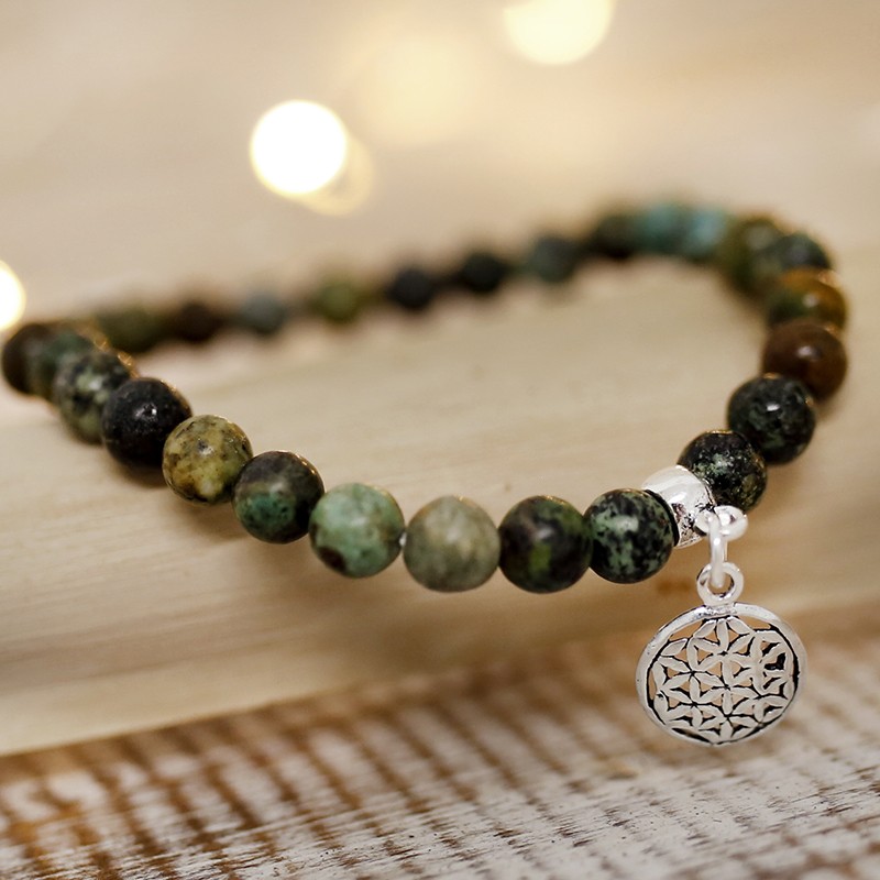 Pulseira de Turquesa Africana com esferas lisas de 6 mm e Flor da Vida de Prata 925