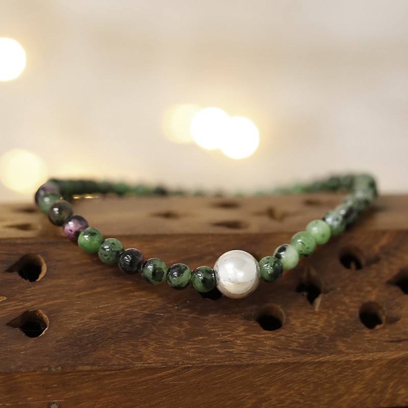 Pulseira de Zoisita com Rubi com esferas lisas de 4 mm e pérola de Prata 925