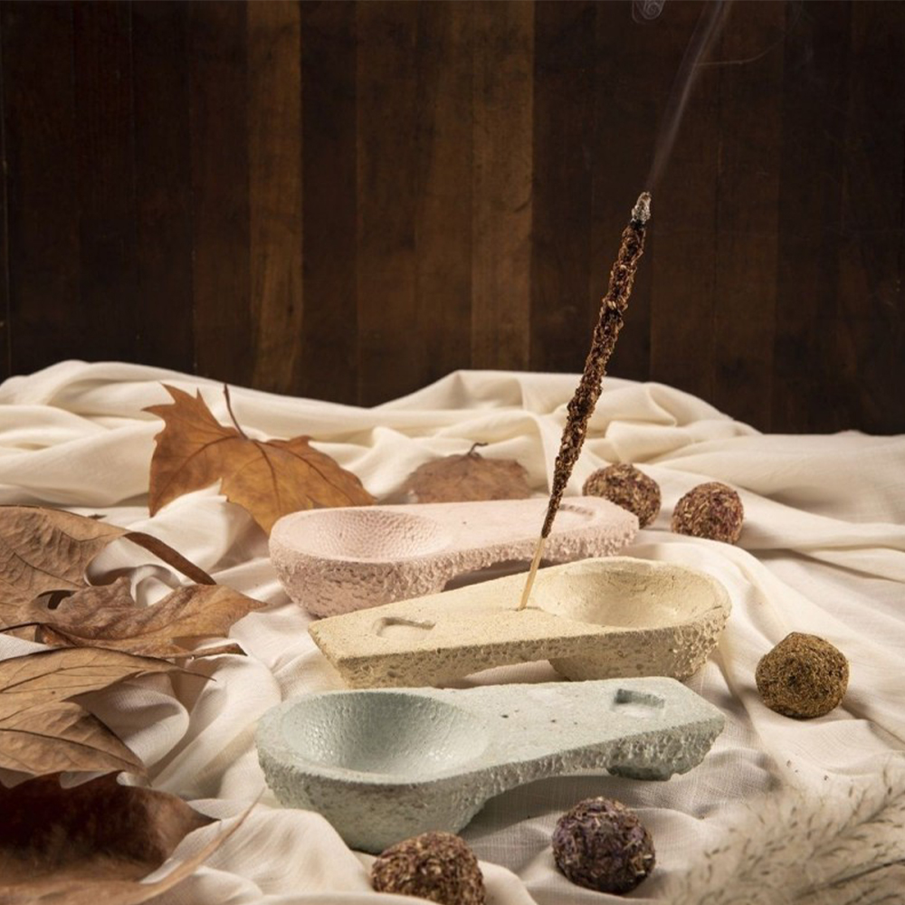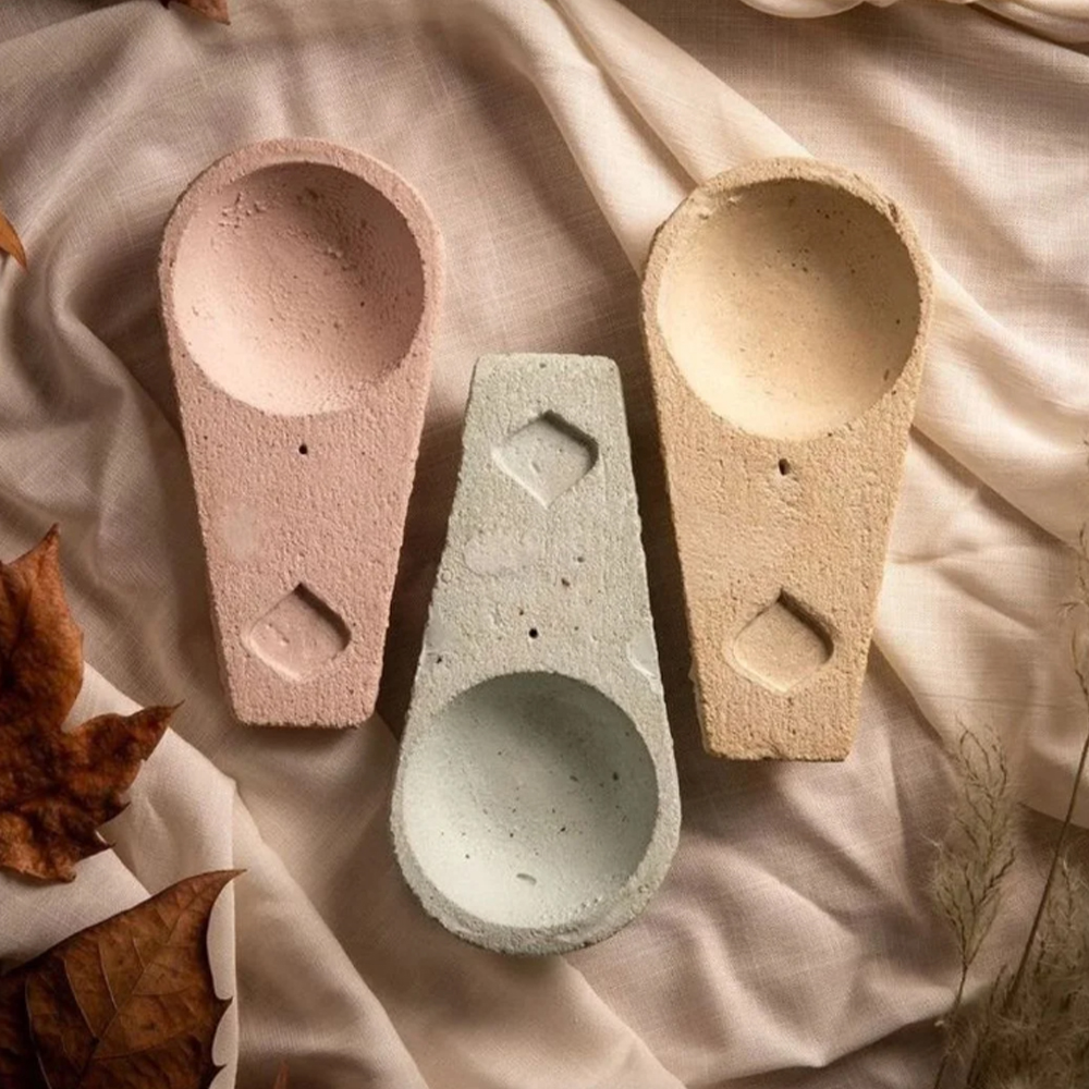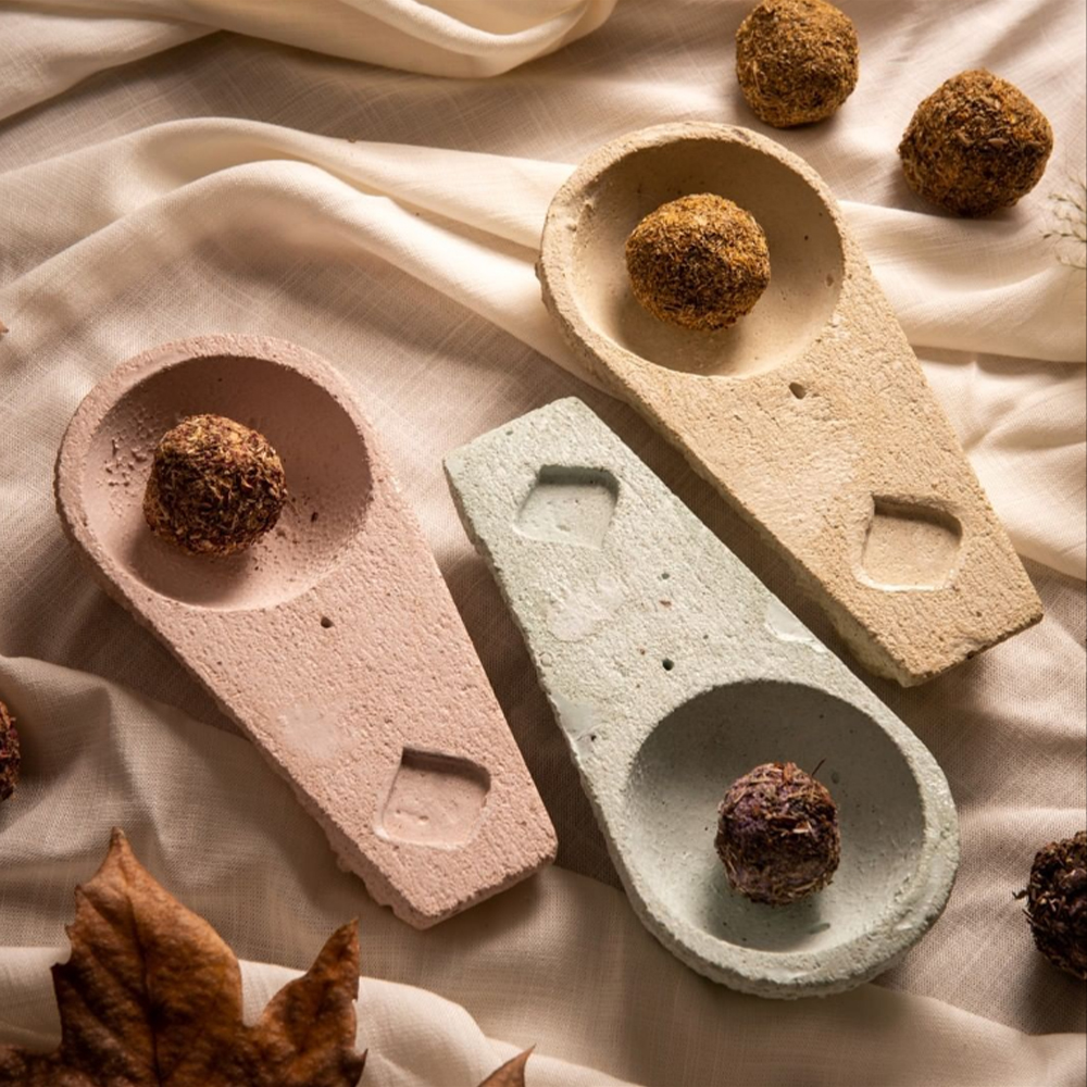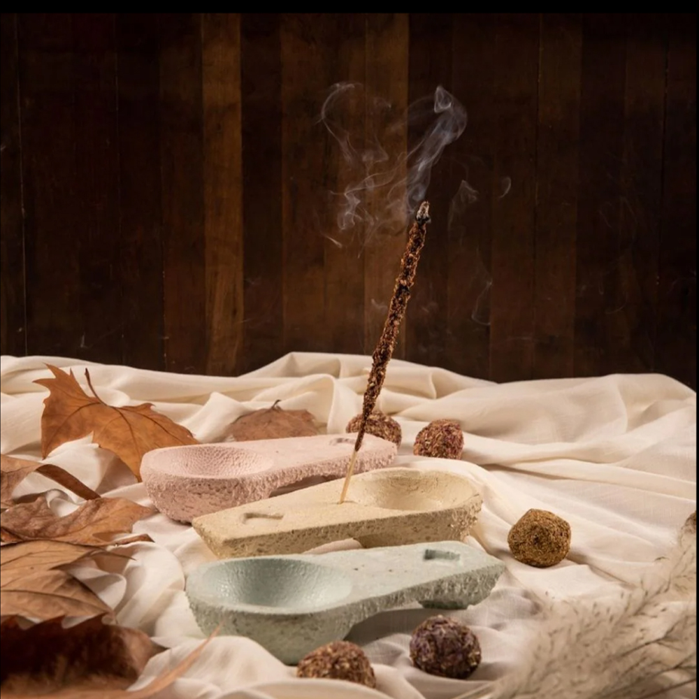 Queimador de incenso em cimento bastante versátil, ideal para queimar diferentes produtos de limpeza energética. Indicado para queimar tochas, pastilhas, resinas, pau santo, ervas doces ou cones de incenso.