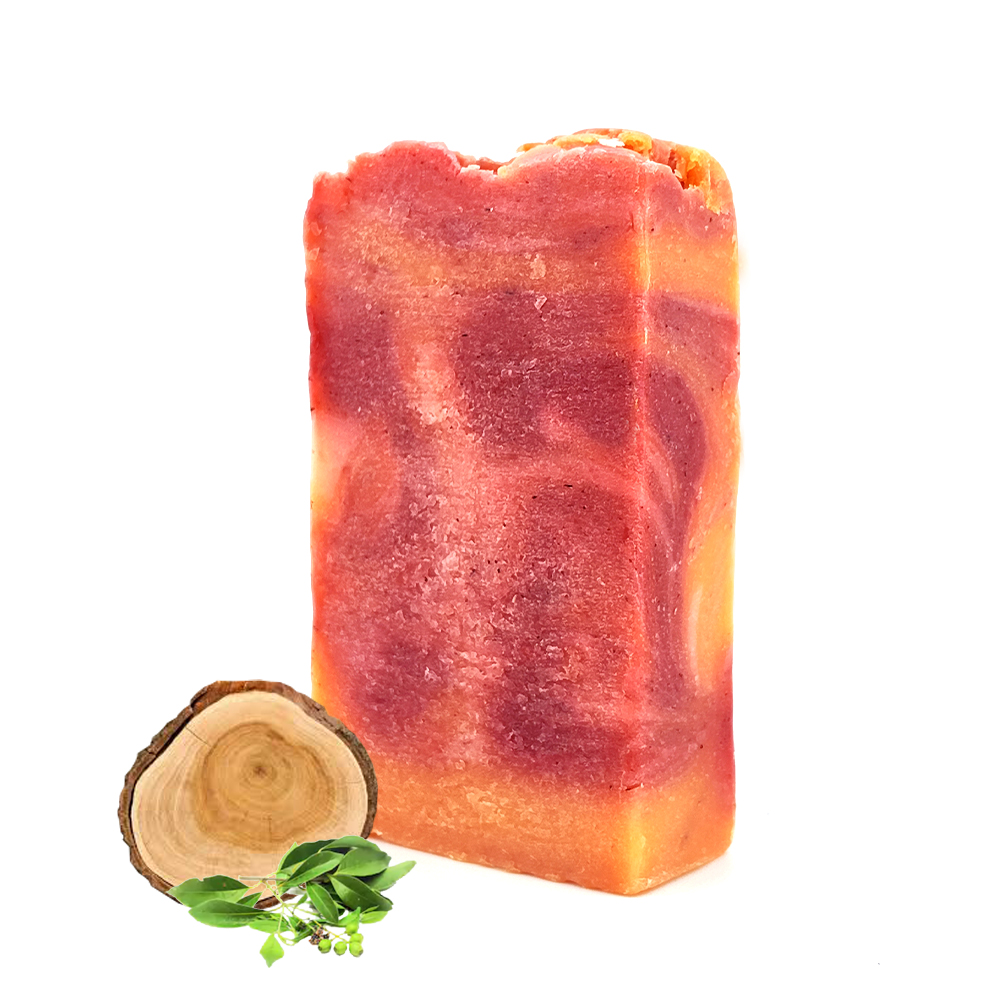 INCI: Sodium Olivate, Sodium Cocoate, Aqua, Glycerin, Parfum, CI 77891, Pterocarpus Santalinus Wood Powder, Linalool, Eugenol, CI 14720, CI 19140