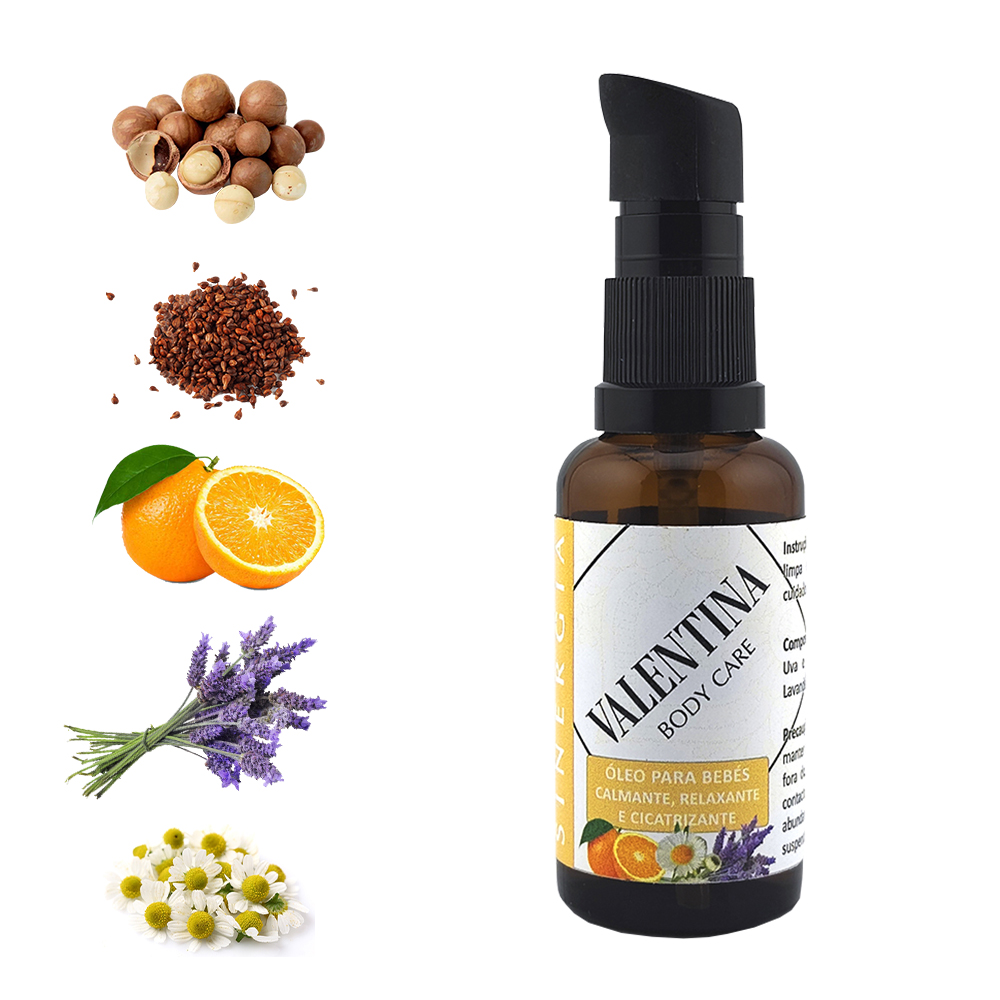 Óleos vegetais de Macadâmia e Uva e óleos essenciais de Laranja doce, Lavanda e Camomila romana.