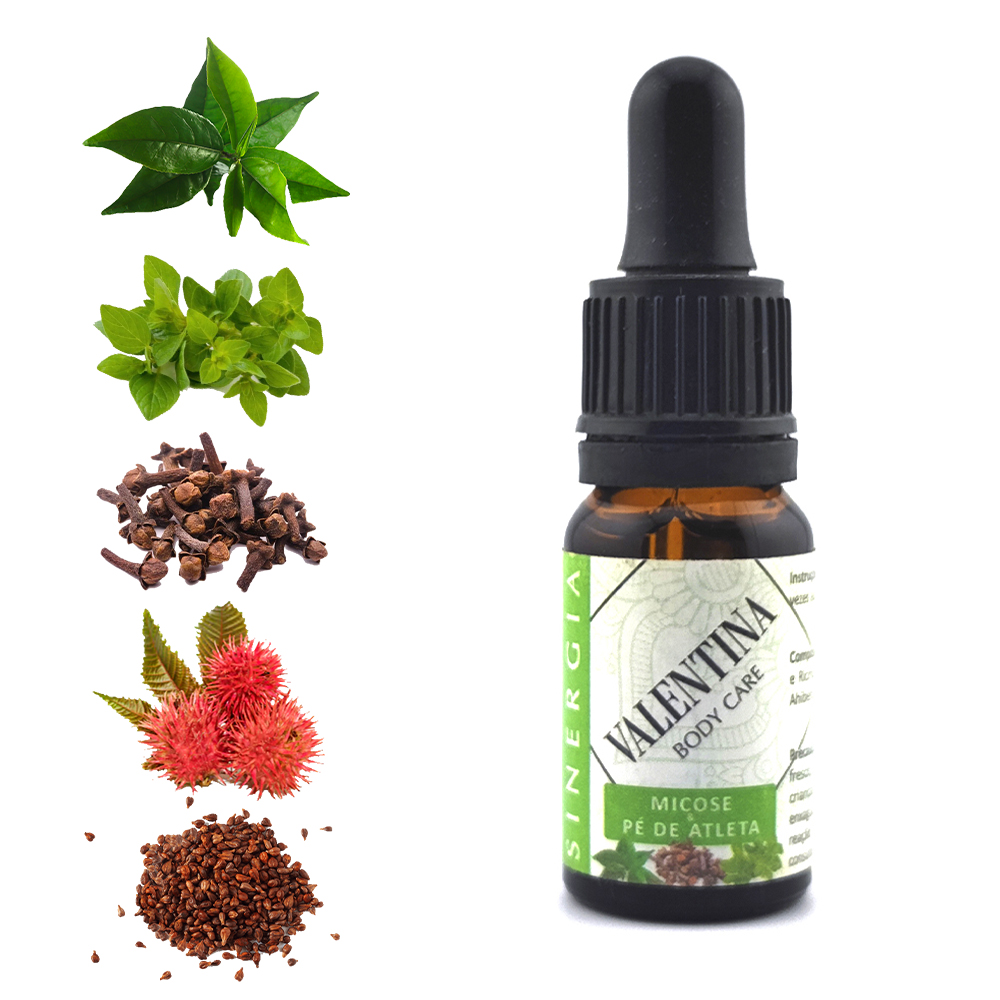 A sinergia natural para MICOSE e PÉ DE ATLETA é composta por óleos essenciais de Árvore-do-Chá, Palmarosa, Gerânio, Canela da China e Erva-Limão, reúne propriedades anti-infecciosas, antifúngicas, bactericidas, antisséticas, antiparasitárias.