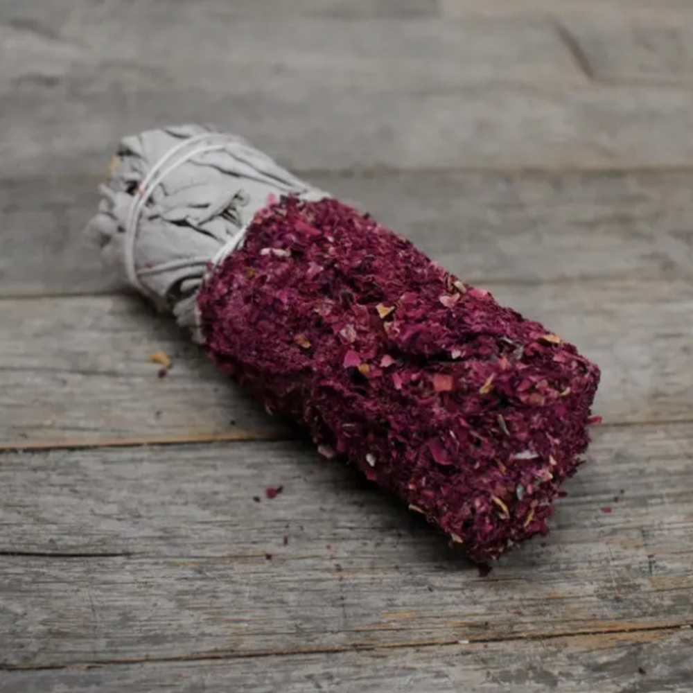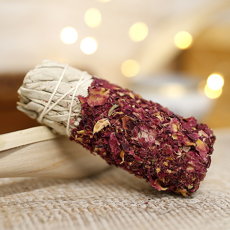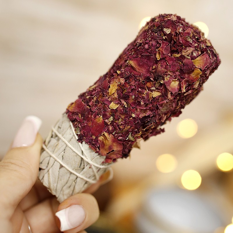 As tochas de sálvia branca com pétalas de rosas vermelhas combinam os benefícios purificadores da sálvia com as propriedades estimulantes das rosas, promovendo o amor, atração, romance, excitação sexual, paixão, paz e a harmonia.
